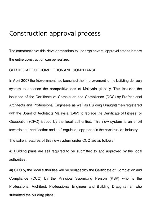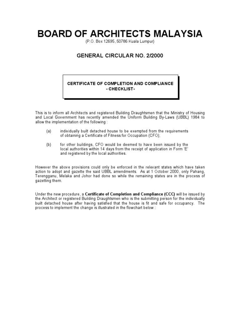 Certificate of Completion Compliance CCC Introduction CCC replaces the Certificate of Fitness for Occupation CFO issued by Local Authorities for projects approved prior to April 2007. The wording in the Architects certificate should only read as stated in Clause 21 1 of the. Certificate of Fitness for Occupation CFO is a certificate issued by the local authorities PBT under the Uniform Building By-Laws of the Street Drainage and Building Act 1974 Act 133 1.