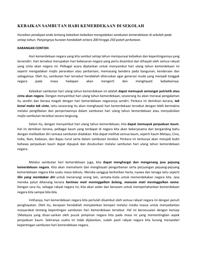Sebagai rujukan pelajar berikut dikongsikan contoh karangan. Dengan mempelajari pelbagai jenis tema dan tajuk soalan penulisan karangan bahasa. Hari kebangsaan disambut pada 31 ogos setiap tahun.